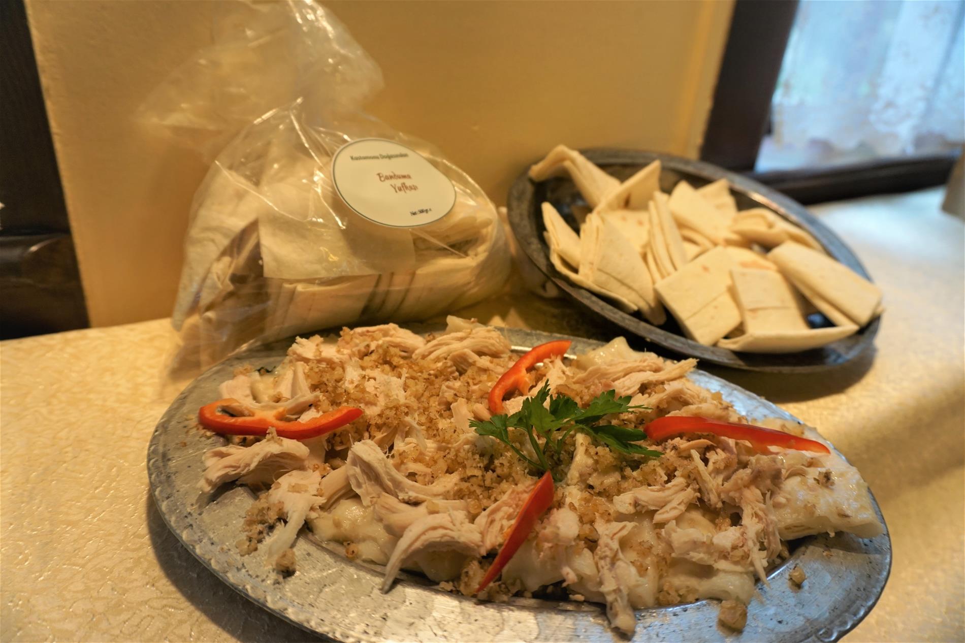1 adet tavuk düdüklü tencereye konur. Üzerini geçecek kadar sıcak su dökülür. 1 adet domates 2’ye ayrılıp haşlama suyuna lezzet katması için eklenir. Tavuk haşlanmaya bırakılır. Haşlanan tavuk suyun içinden alınıp soğutulur ve didiklenir. Tavuğun suyu da süzülürek içindeki soğan ve domates parçalarından arındırılır. İçine 1 yemek kaşığı tereyağı ve 1çay kaşığı karabiber eklenip yeniden kaynatılır.Yufkalar enine 3 parçaya kesilir. Her parça 2’ye katlanarak 4’er parmak genişliğinde dilimlenir. Ayrı bir tavada 250 gr tereyağı kızdırılır.Servis tepsisi eritilimiş tereyağıyla yağlanır. Yufkalar tavuk suyuna batırılarak tepsinin ortası boş kalacak şekilde dizilir. Üzerine biraz daha tereyağı gezdirilir, ceviz içi serpilip üzerine yine tavuk suyunda ıslatılmış yufkalar serilir. Her kat yufkalar bitene kadar yağlanıp ceviziçiyle kaplanıp hazırlanır. En üst kat da bolca yağlanıp cevizle kaplanır. Tepsinin boş bırakılan orta kısmı didiklenmiş tavuk etiyle doldurulur.